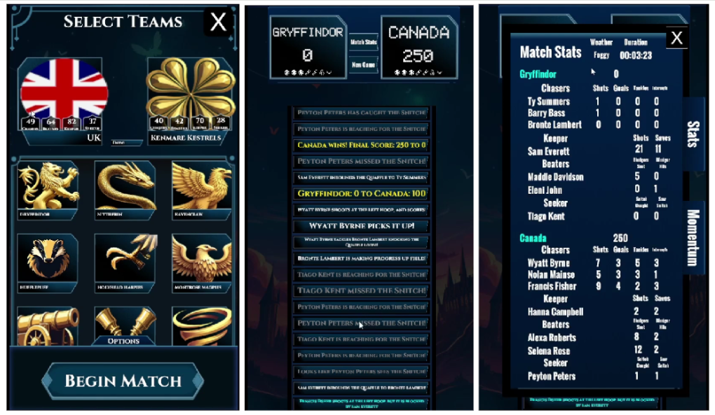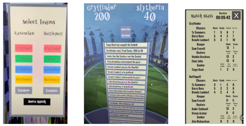 From there – I could create different teams and slot them into Home and Away. I created the 4 Hogwarts Houses that the player could choose from. When that 1 versus 1 mechanic was completed with the 4 Hogwarts houses, I considered the project done!